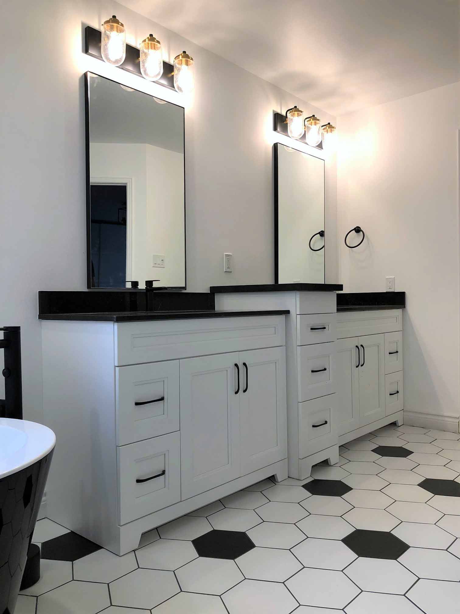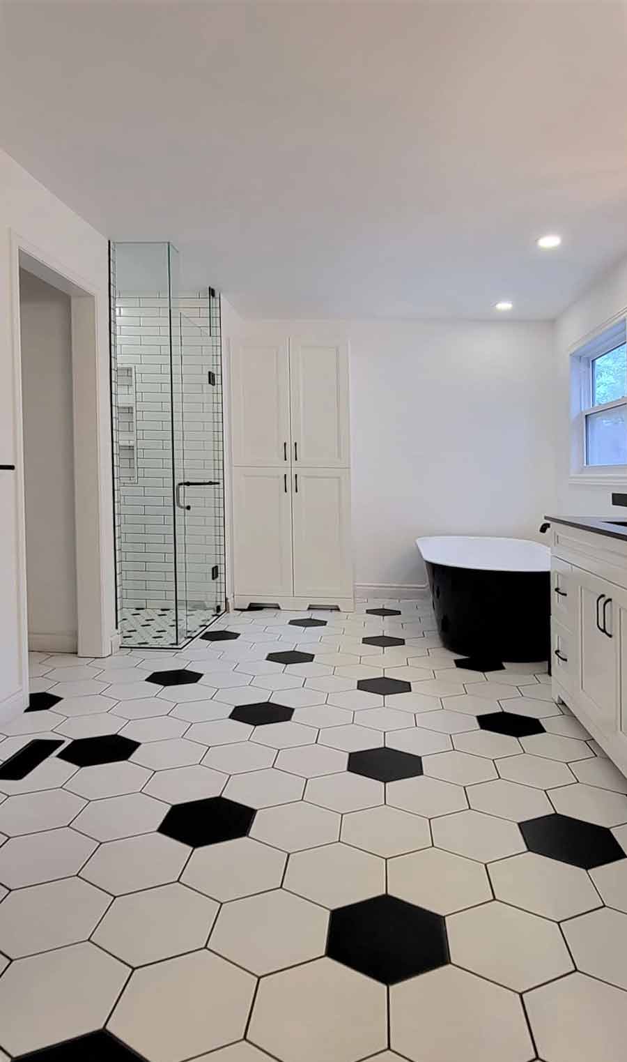 Working with a monochromatic palette means every texture and shape matters. We started by introducing bold hex tiles on the bathroom floor, a feature that immediately creates interest without overwhelming the space. In the shower, crisp white subway tiles paired with dark grout emphasize the classic pattern while adding a dramatic edge. This approach helps the entire room feel cohesive and intentional. For clients exploring similar upgrades, our team can walk you through these material pairings during your consultation.