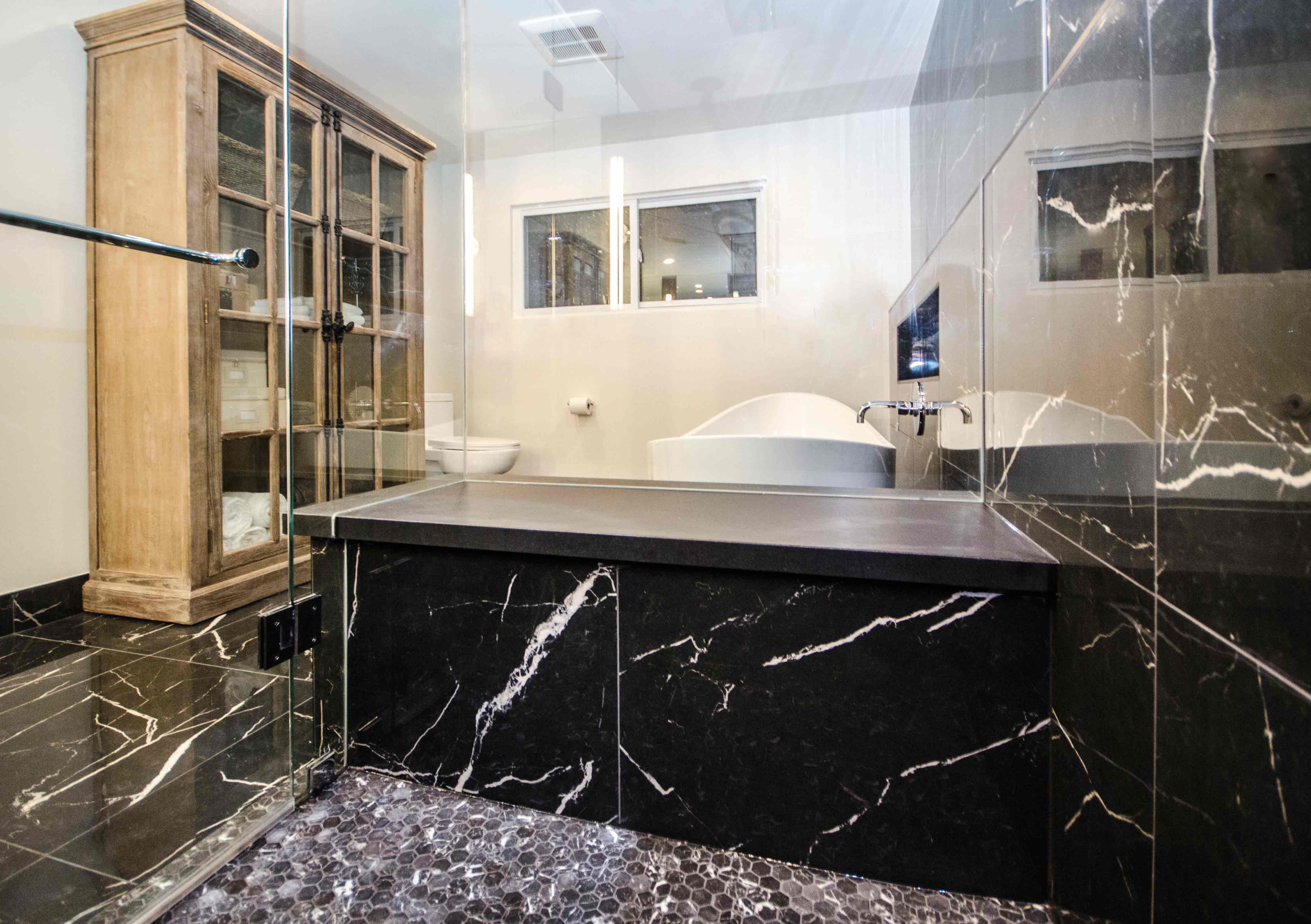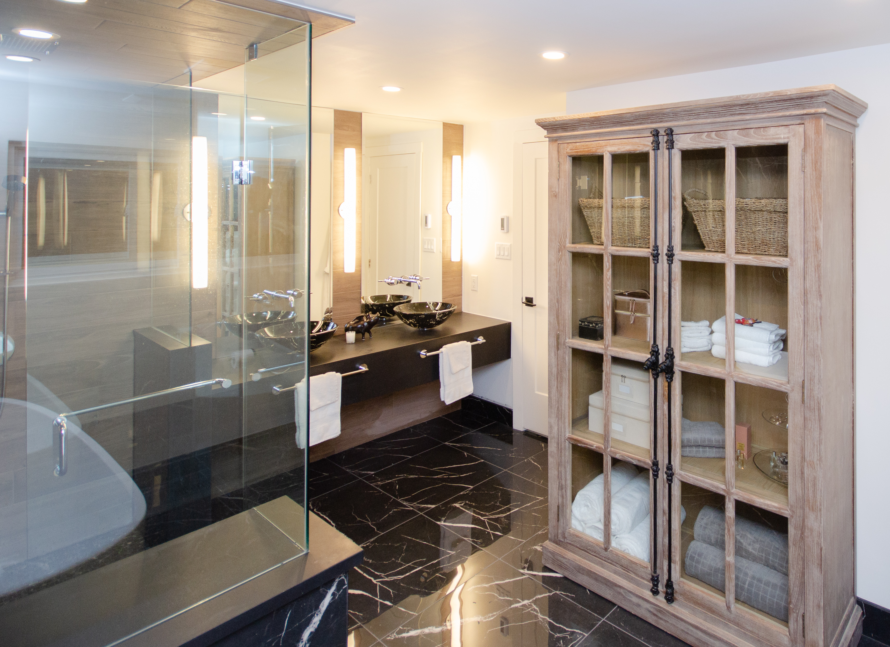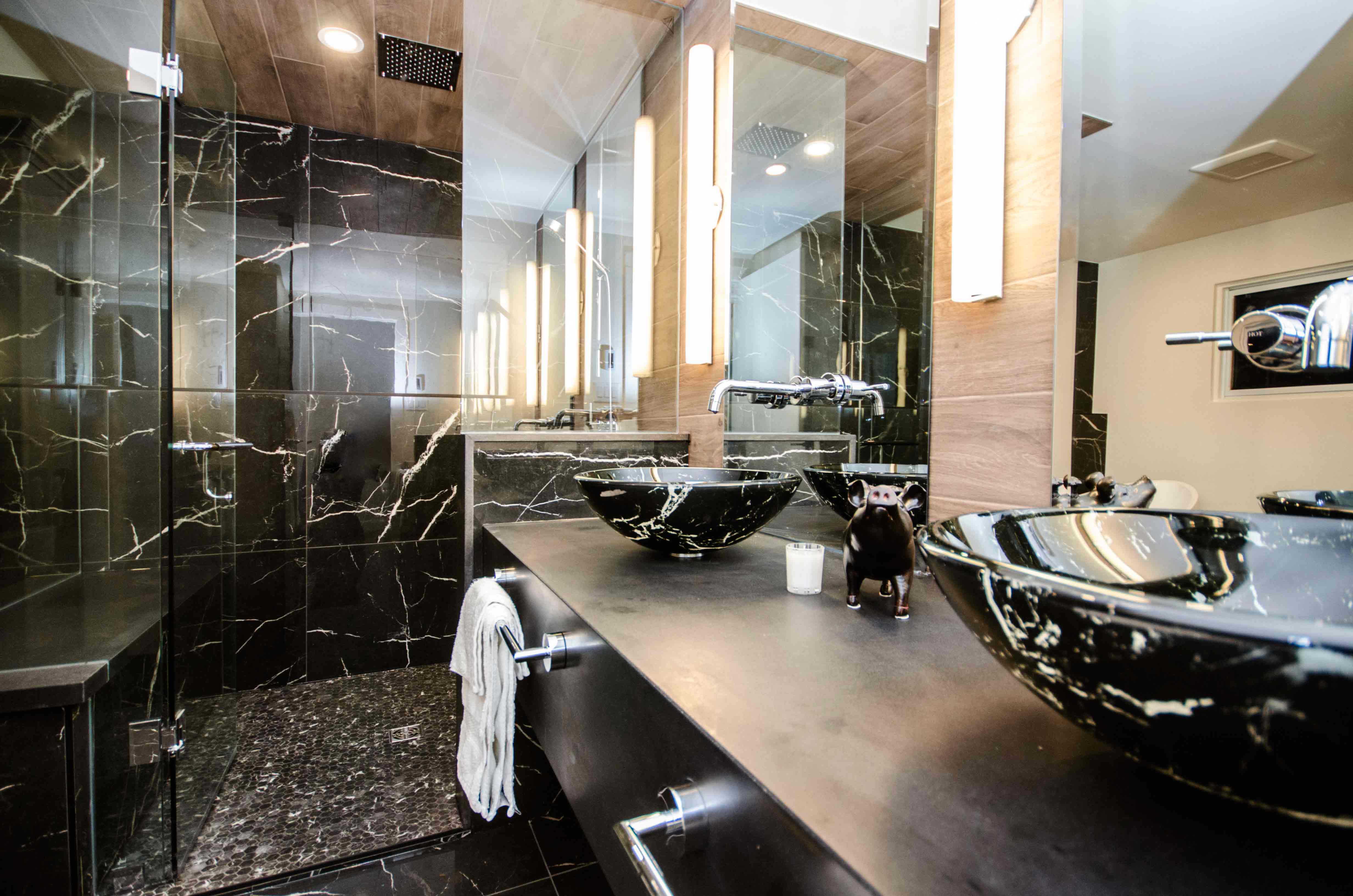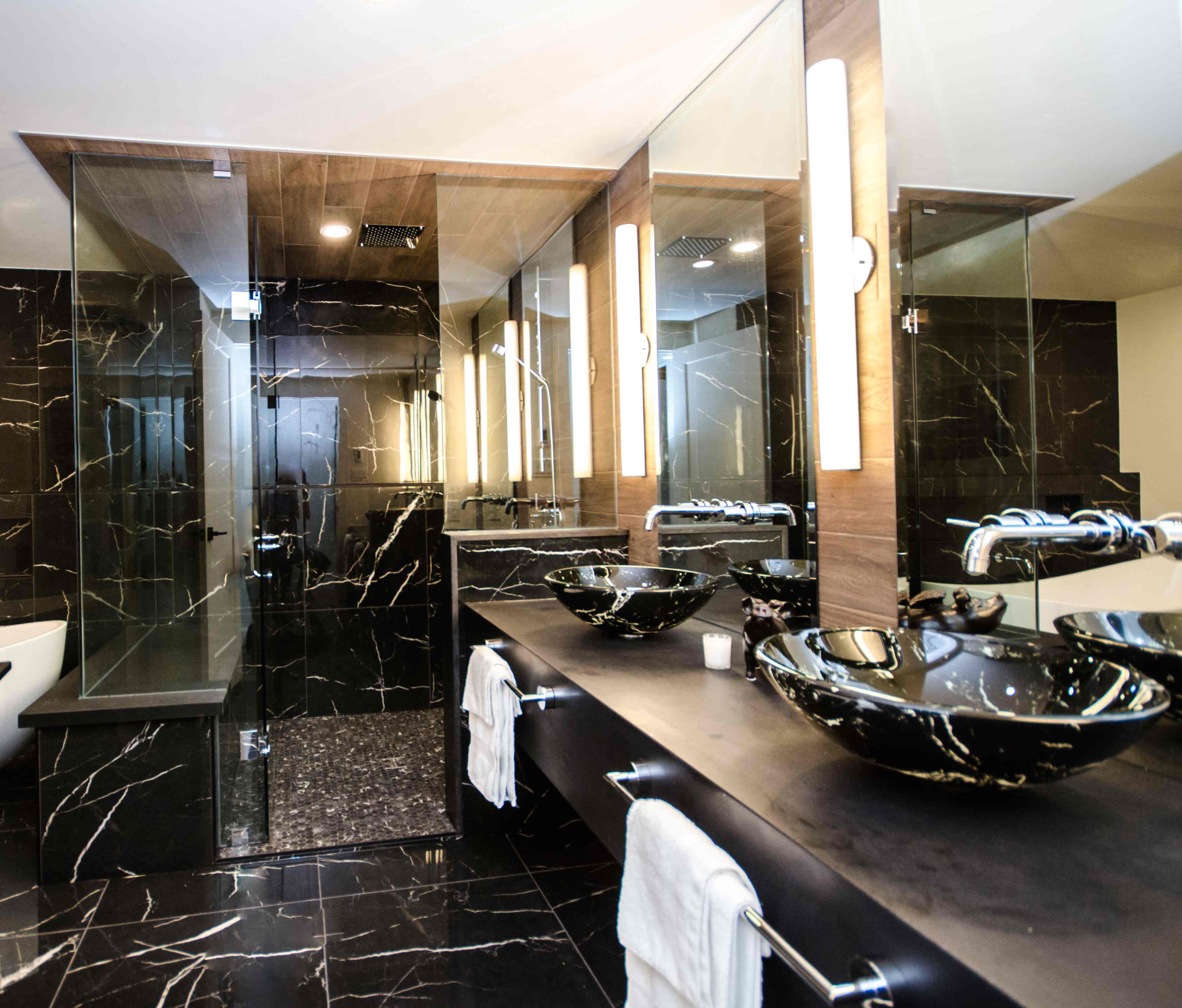 Floor & Bath Design converted a small bedroom adjacent to the master bedroom to create this stunning large ensuite featuring Nero Marquina 24x24 porcelain tiles. Furthermore, matching sinks were found to add to the dramatic look.