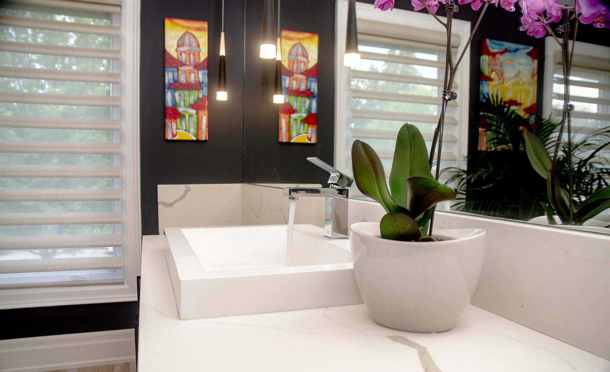 This bold ensuite featured a freestanding tub with a wall-mounted tub filler, partially hidden shower, and dramatic black walls with colorful decor. The quartz countertop incorporated a spacious makeup area as per the request of the customer.