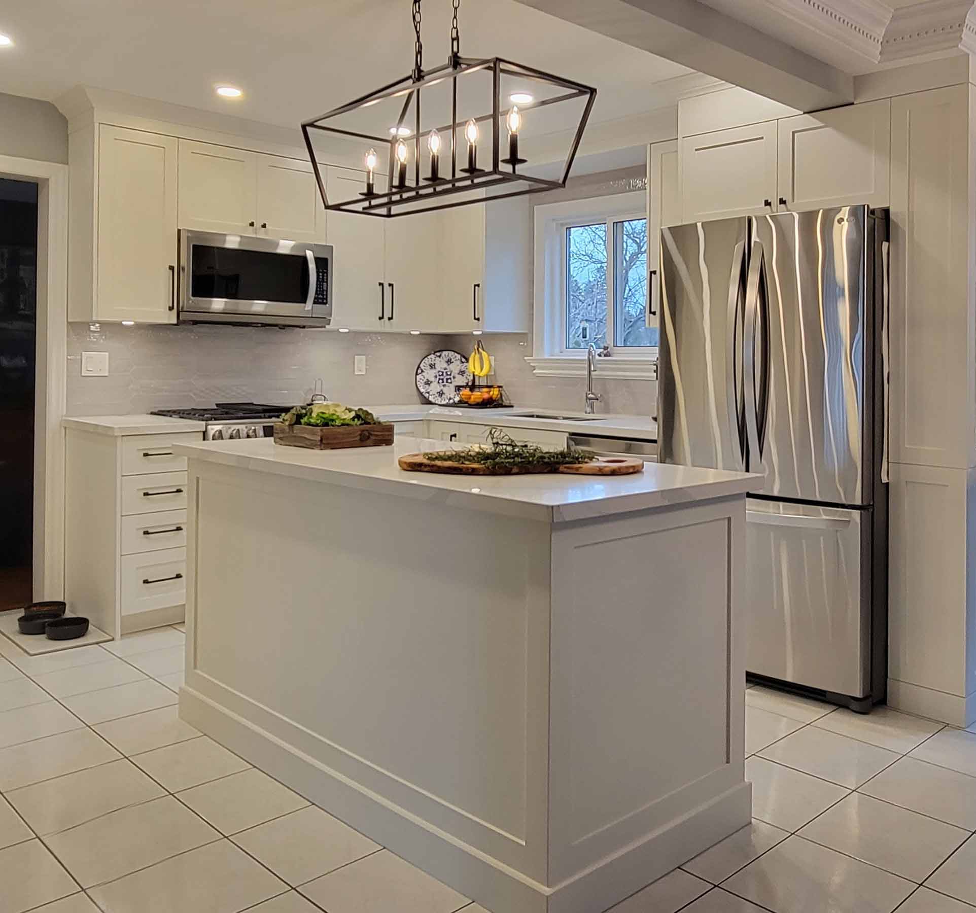 To keep this Whitby kitchen feeling bright and airy, we chose an all-white palette that reflects natural light and visually expands the room. A textured backsplash adds depth and movement while still blending seamlessly with the rest of the finishes. This detail keeps the kitchen from feeling flat without overwhelming the small footprint.