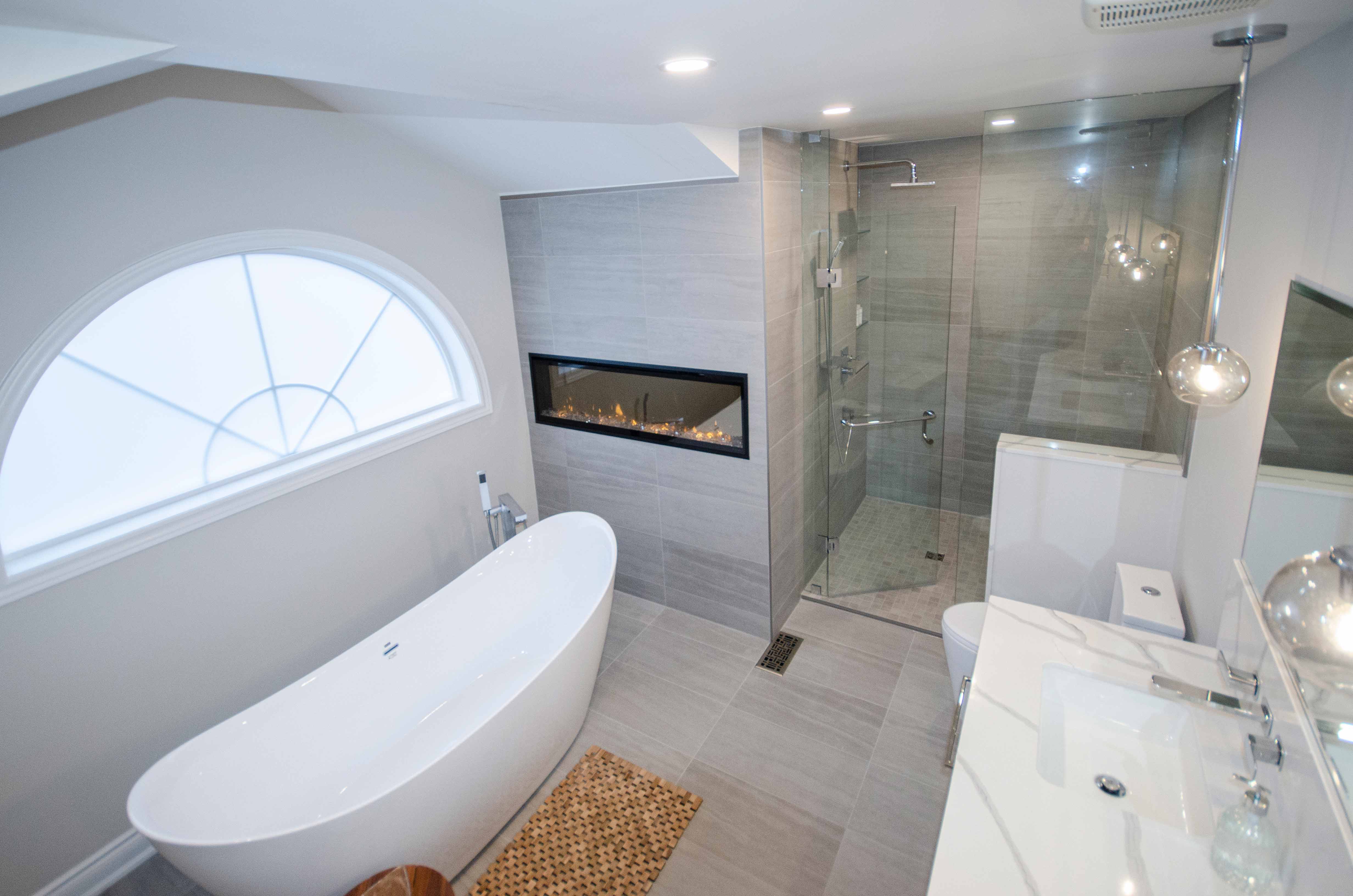 The goal for this Ajax ensuite was to create a warm, modern retreat without losing practical function. The gas fireplace instantly became a design anchor, setting the tone for a cozy, spa-like environment. Our team paired it with a sculptural free-standing tub positioned to capture the fireplace glow, giving the room a high-end boutique-hotel feel. The funky blue cabinetry adds personality while still offering smart storage solutions and a durable finish ideal for everyday use.