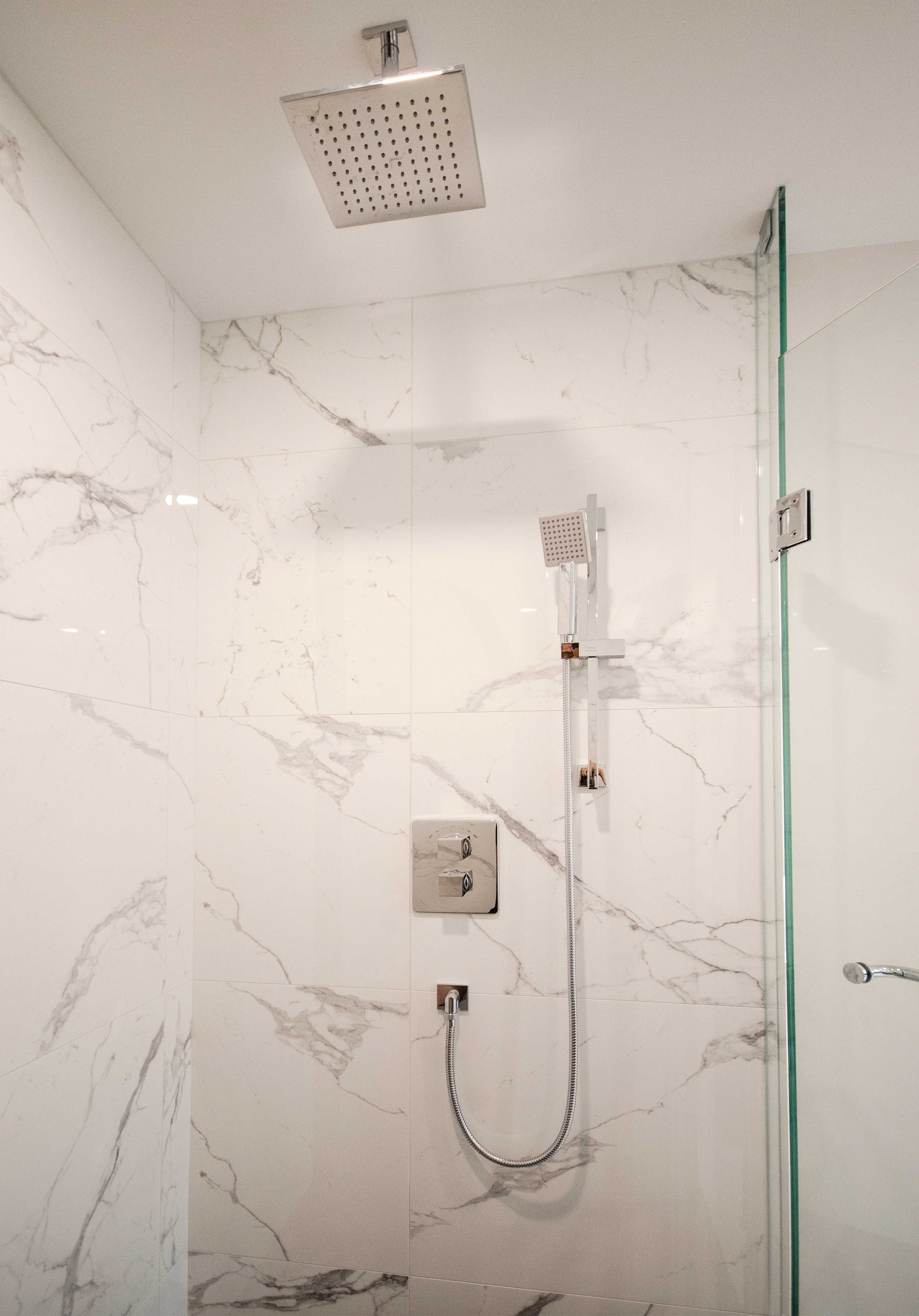 - Curbless walk-in shower