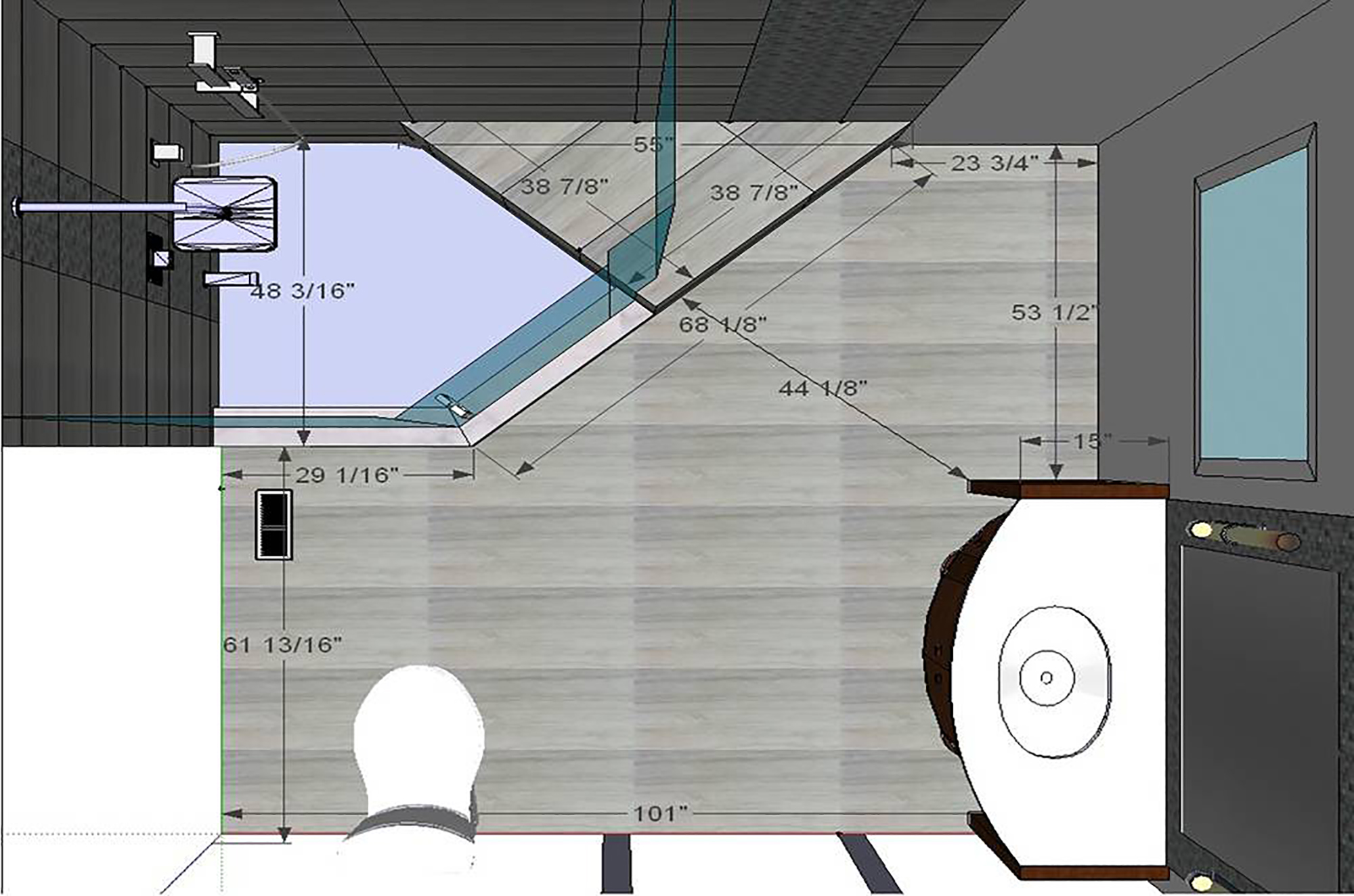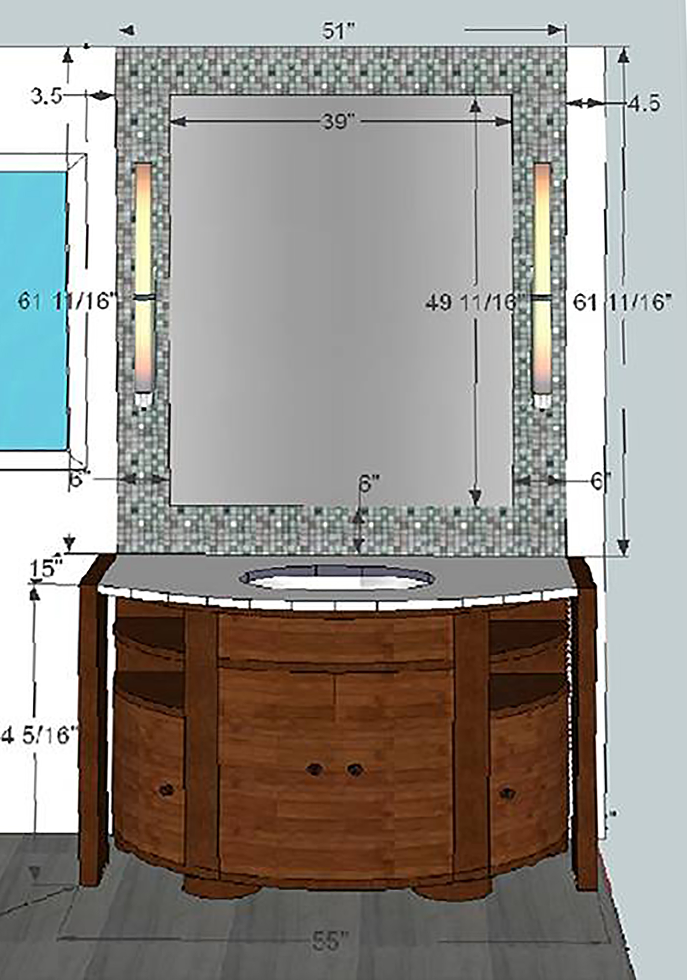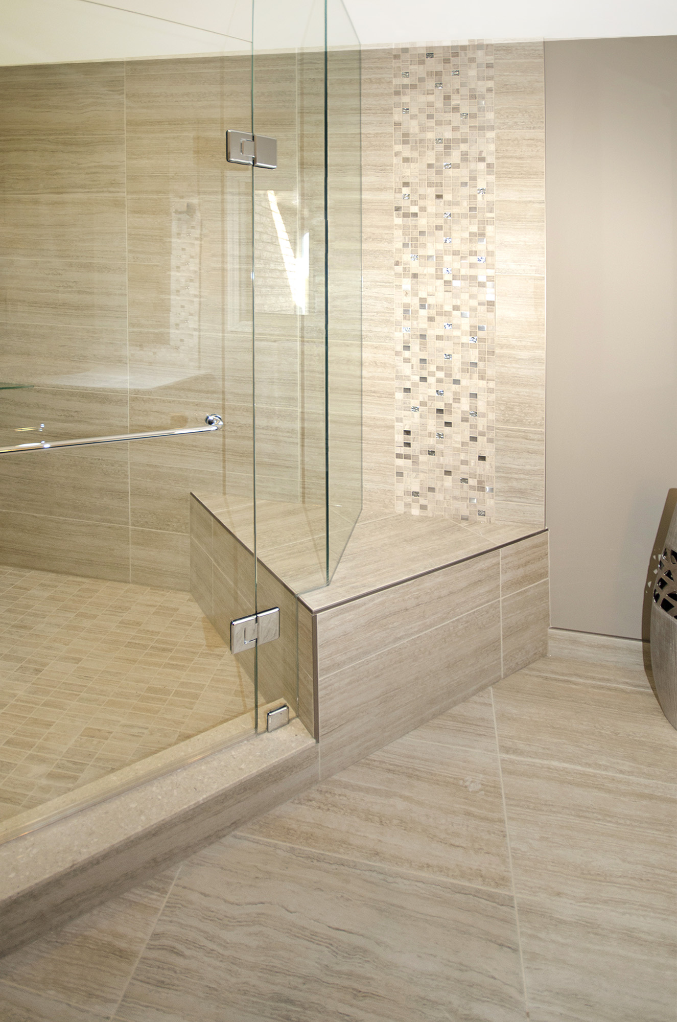 Here is an example of a customer who wanted to do away with a corner bathtub in favor of a large shower. The shower features a double-sided bench. In this design, Floor & Bath Design used a decorative mosaic in the shower and around the custom vanity mirror.