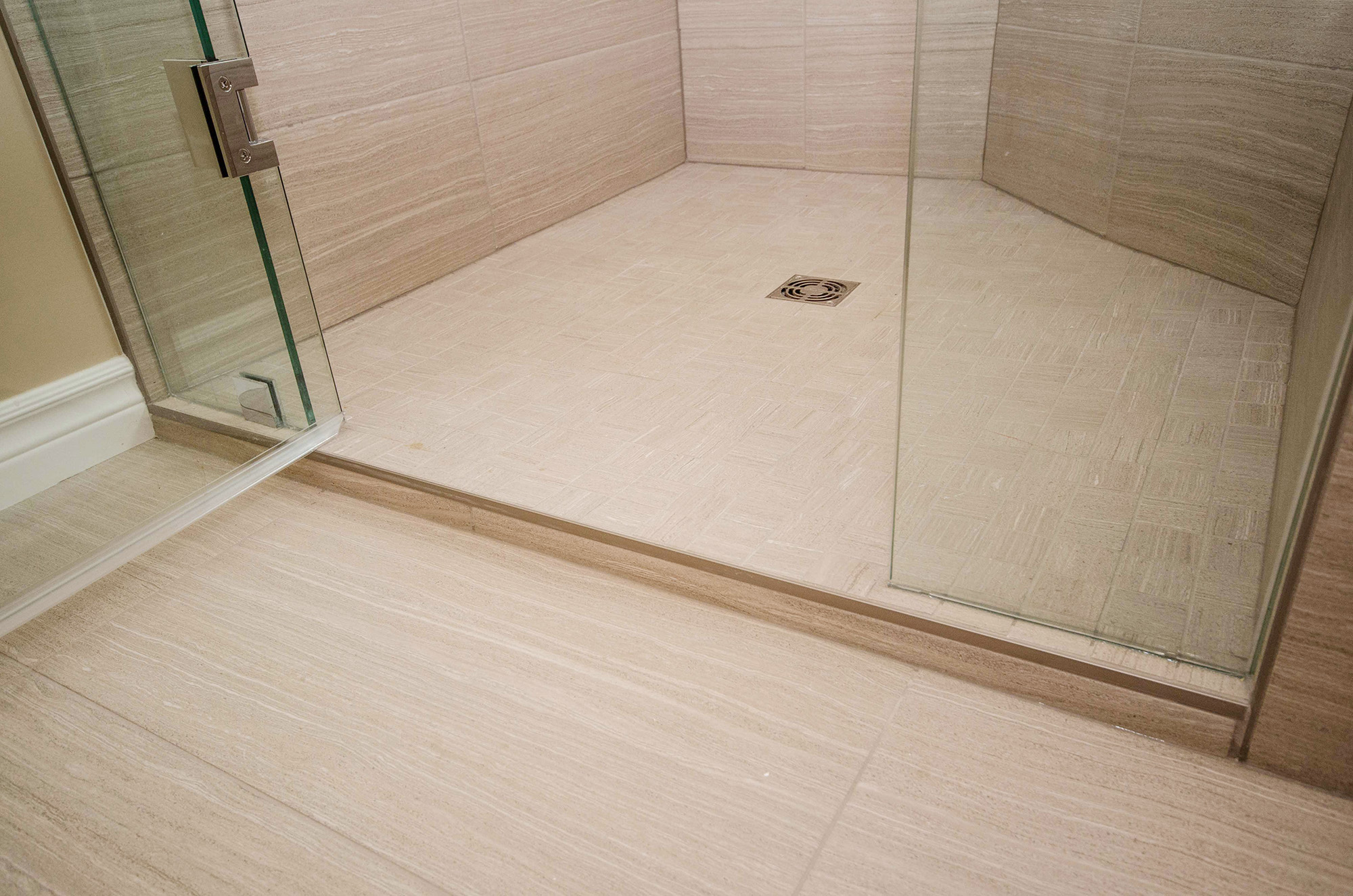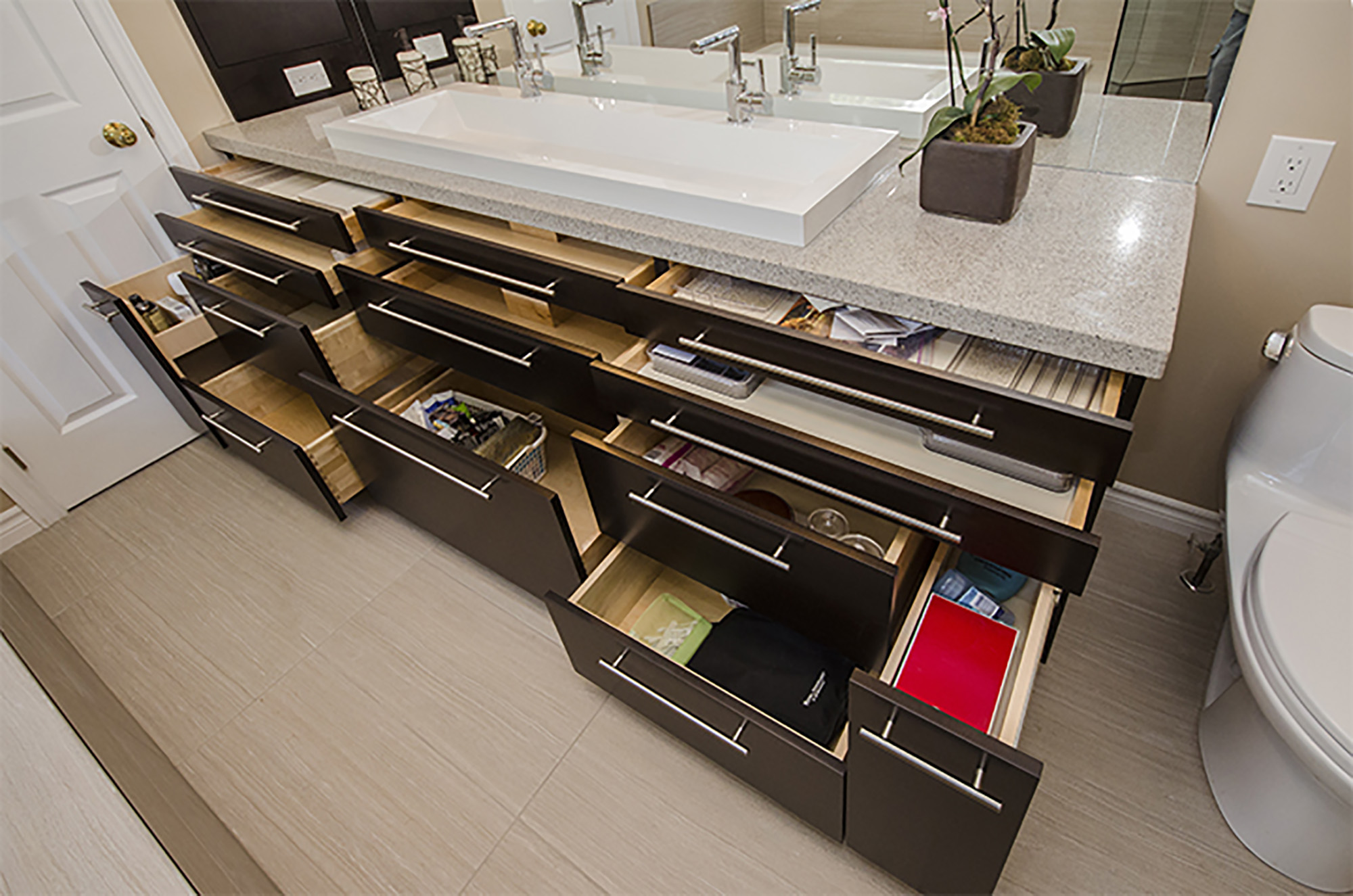 Floor & Bath Design suggested a trough sink to accommodate the customers' request for a lot of storage in their master bathroom. The sink is big enough to act as a double sink, it is classy and creates a unique look.