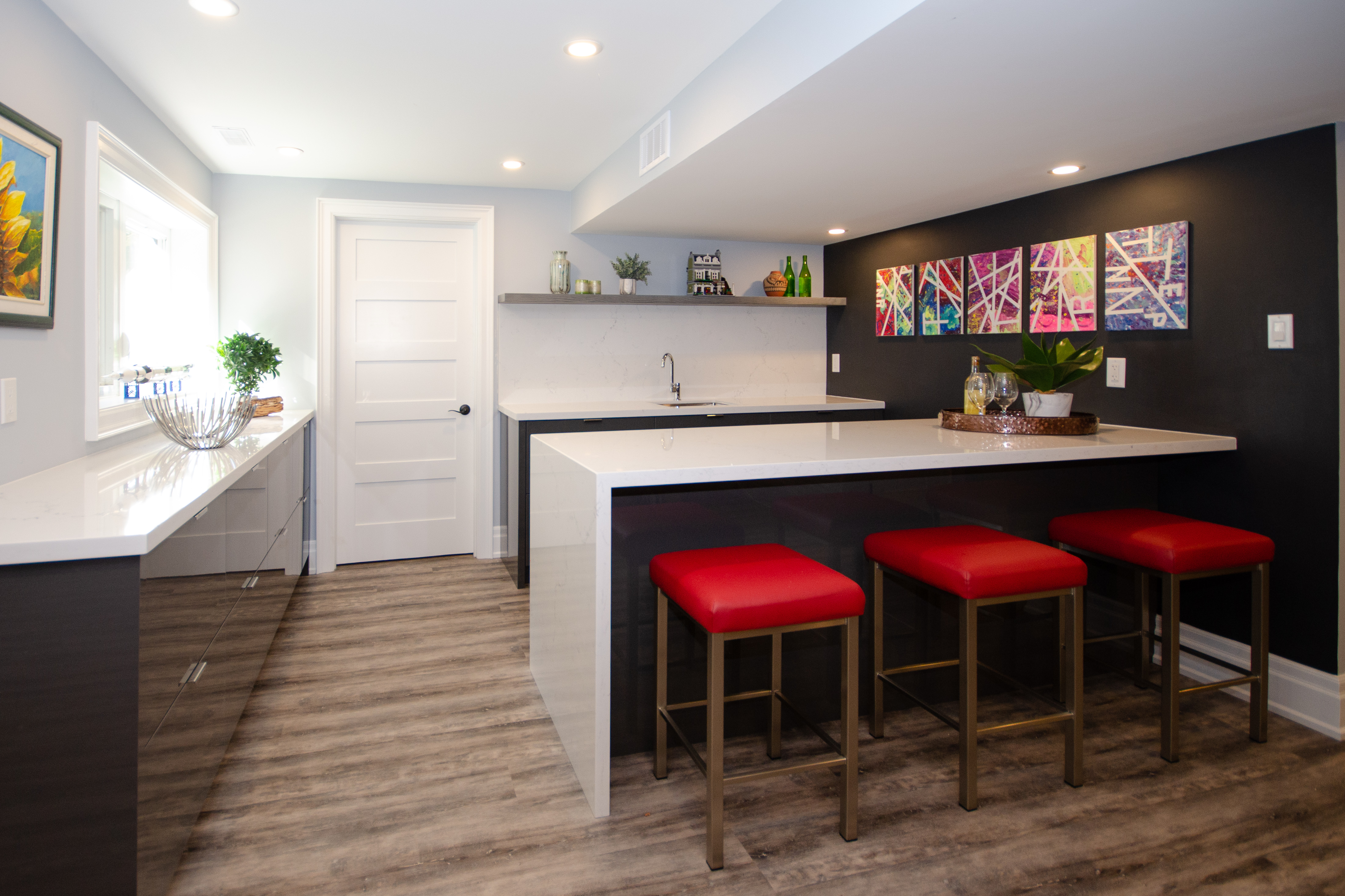 This request from the customer was to convert the unfinished basement into a family game and entertainment area. Floor & Bath Design provided concepts and designs as well as expert installers to create this beautiful space for the whole family. There is a wet bar, game area, fireplace, and entertainment corner. Everybody can find something for him or herself. The walls are covered with stacked stone glacier-white tiles.